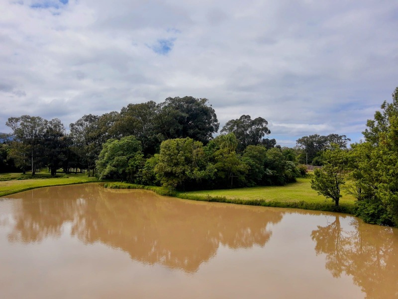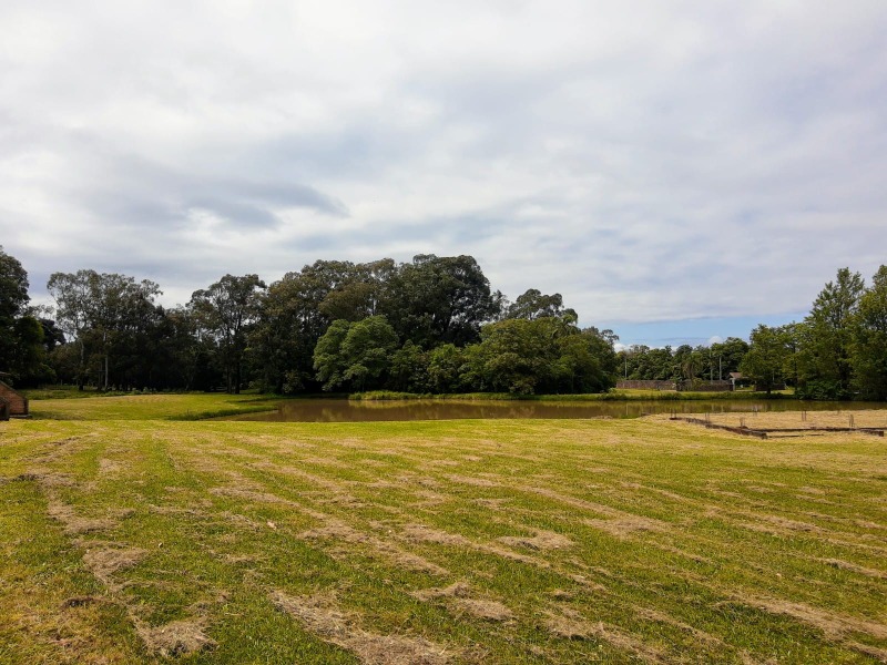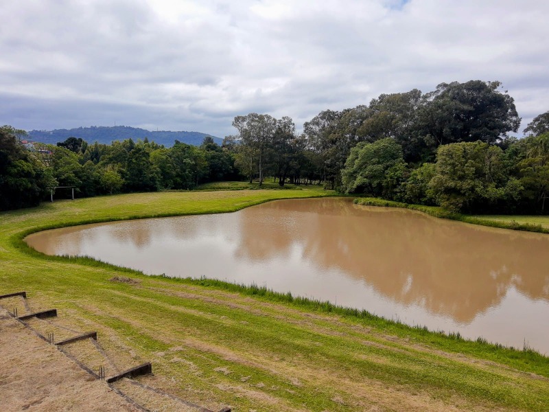 Terreno plano, lindo pátio arborizado, gramado e lago.